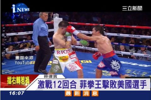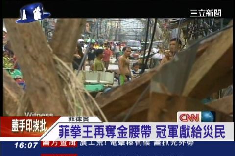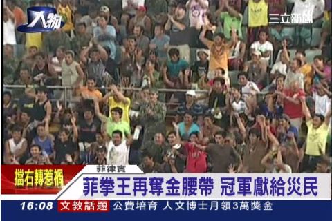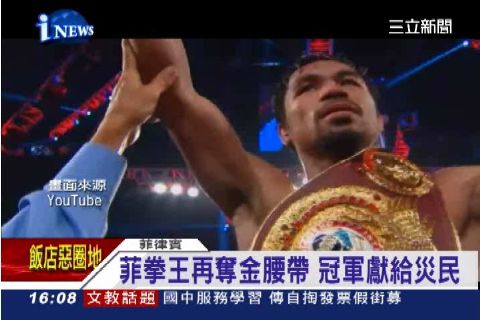 菲律賓國會議員兼世界拳王曼尼帕奎奧近日在澳門重新復出,正好碰上世紀風災重創祖國。他背負了全國人民期待,在第12回合以120比108的壓倒性姿態,痛宰前來挑戰的美國選手里奧斯。帕奎奧表示,這個冠軍的榮耀要獻給菲律賓,尤其是那些被颱風奪去家園的災民。